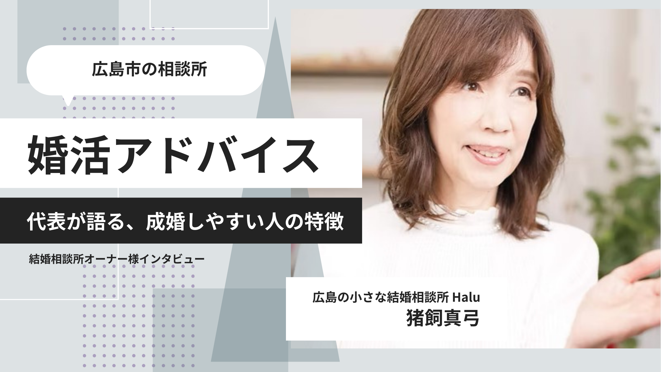 広島県広島市・廿日市市を拠点に活動する「広島の小さな結婚相談所 Halu」の代表、猪飼真弓さんにインタビューを行いました。