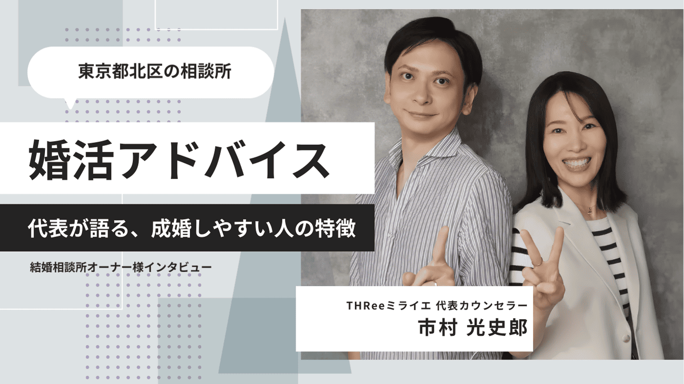 アラフィフ夫婦が運営する相談所です。自身の病気や妻の大病を夫婦で支え合った経験から、結婚を人生の荒波を乗り越える「かけがえのないチーム」と定義し、孤独のない未来を願って活動しています。赤羽の街とプロ野球をこよなく愛する親しみやすい人柄も魅力。THReeミライエとは「あなたと私たち夫婦の3人で未来をつくる」という意味を持ち、成婚後も家族ぐるみで付き合える温かな信頼関係を大切にサポートいたします。